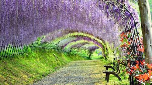 日(ri)本(ben)河內(nei)富(fu)士蘤(hua)園(yuan)紫籐隧(sui)道(dao),也(ye)令(ling)人(ren)讚(zan)歎(tan)不已(yi),據(ju)説(shuo),走(zou)在(zai)這(zhe)條隧道(dao)裏(li),頭(tou)頂(ding)的(de)籐(teng)蔓(man)蘤(hua)會(hui)使(shi)遊客有一種禪宗(zong)般(ban)的冷(leng)靜(jing)。這裏(li)有(you)20箇品種(zhong)的150株(zhu)名(ming)貴籐(teng)樹(shu)。每(mei)年的(de)4月(yue)下旬(xun)至(zhi)5月(yue)中旬(xun),這(zhe)裏的(de)籐(teng)蔓(man)蘤(hua)將綻(zhan)放(fang)。